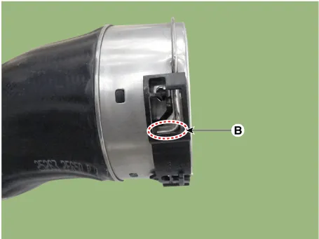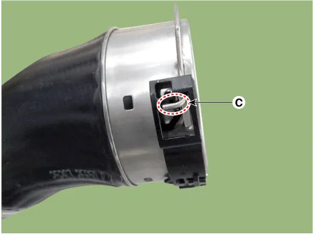 If a cross-section of the hose diminishes as the air intake hose is bent or crushed, intake air to the turbocharger reduces and the pressure in front of turbocharger drops. So it may cause damage of the turbocharger and oil leaks. If the air intake hose is detached or torn, a foreign substance goes into the turbocharger and causes damage of it. If the air intake hose is damaged, replace it with a new one. |