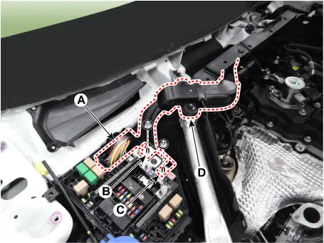 Disconnect the wiring connector and harness from the engine room.