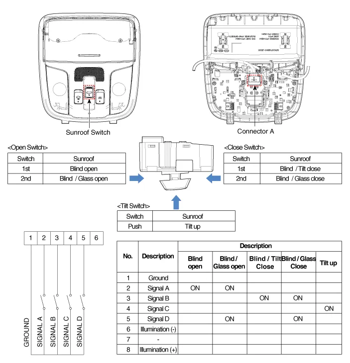 Remove the wide sunroof switch (A) after loosening the mounting screws.
