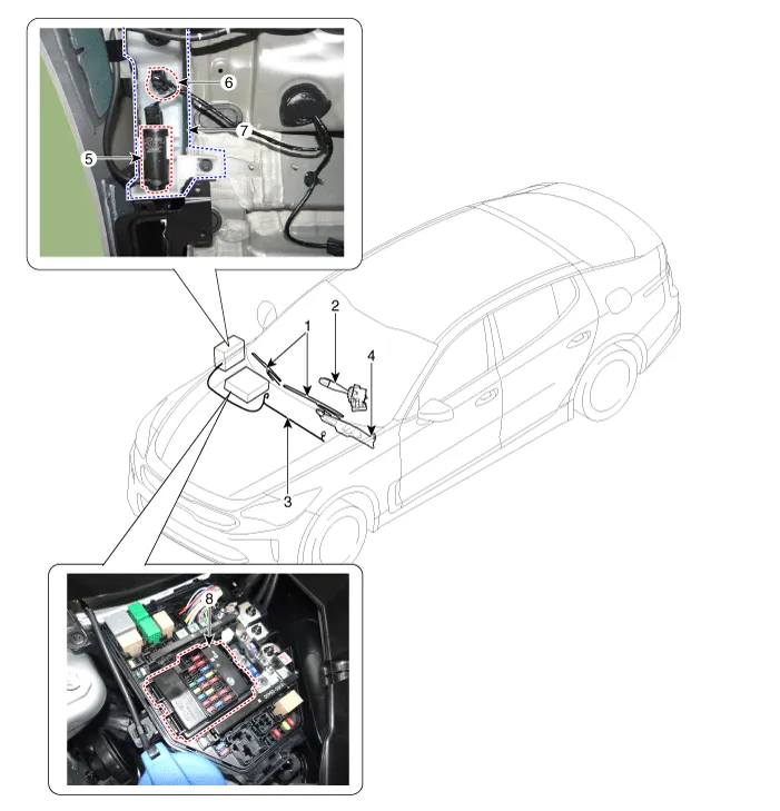 5. Washer motor 6. Washer fluid level sensor 7. Washer reservoir tank 8. Wiper/Washer relay (Built-in Metal core block PCB) |