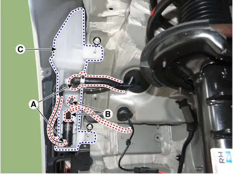 Disconnect the washer hoses (A) and connector (B). |