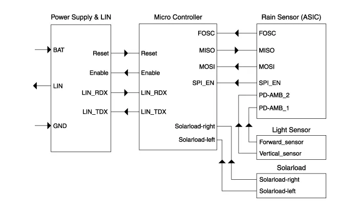 Integrated rain sensor is composed of 2 LEDs and 2 photo diodes to detect rainfall, 2 photo diodes to detect light, 1 photo diode to detect the amount of sunshine, and bracket. |