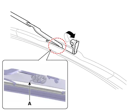 If necessary, release the wiper blade fixing clip by pulling up and remove the wiper blade from the inside radius (A) of wiper arm.