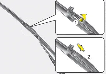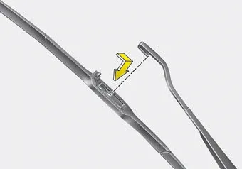 2. Lift up the wiper blade clip. Then pull down the blade assembly and remove it.